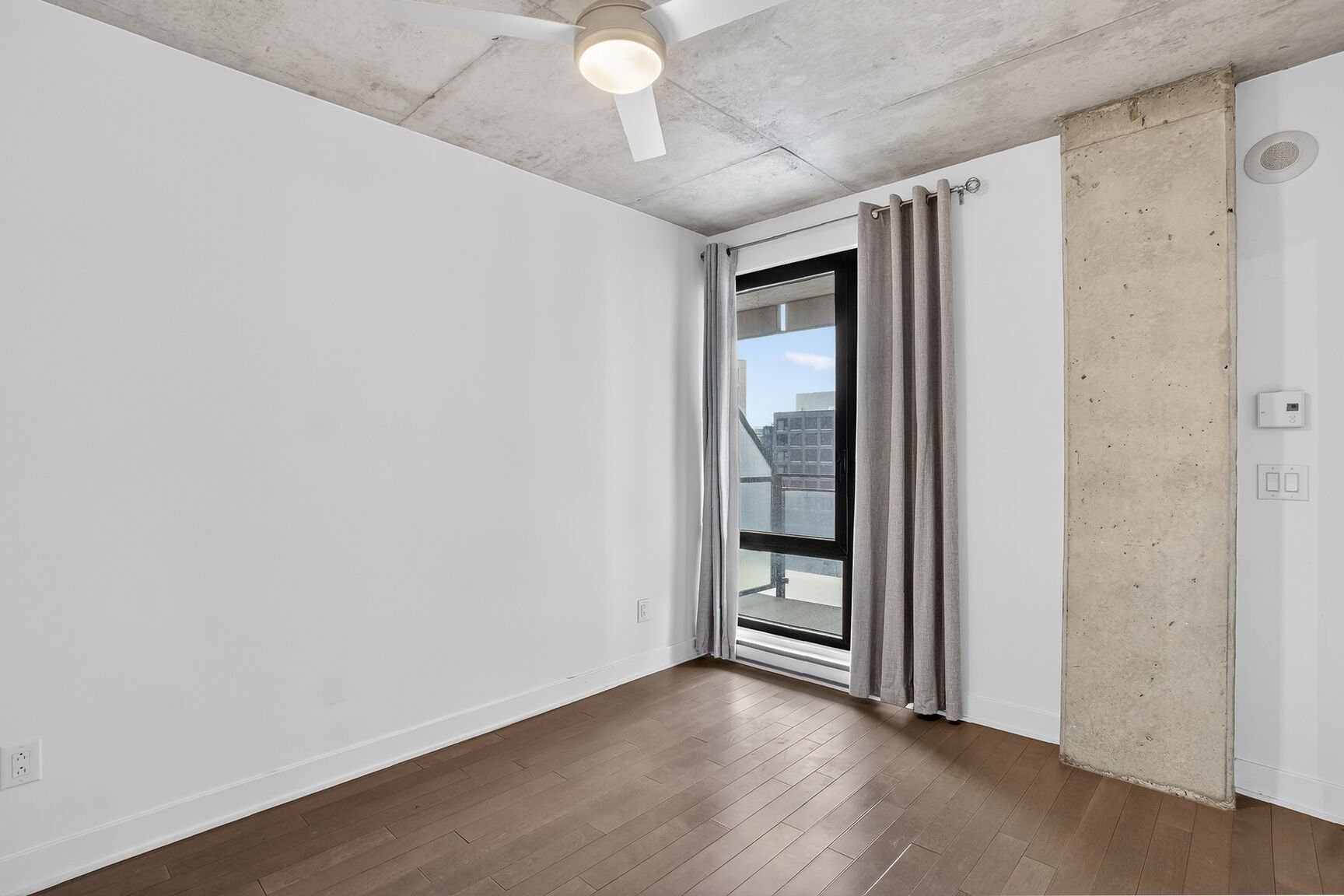 closed bedroom. Large windows create a bright, airy