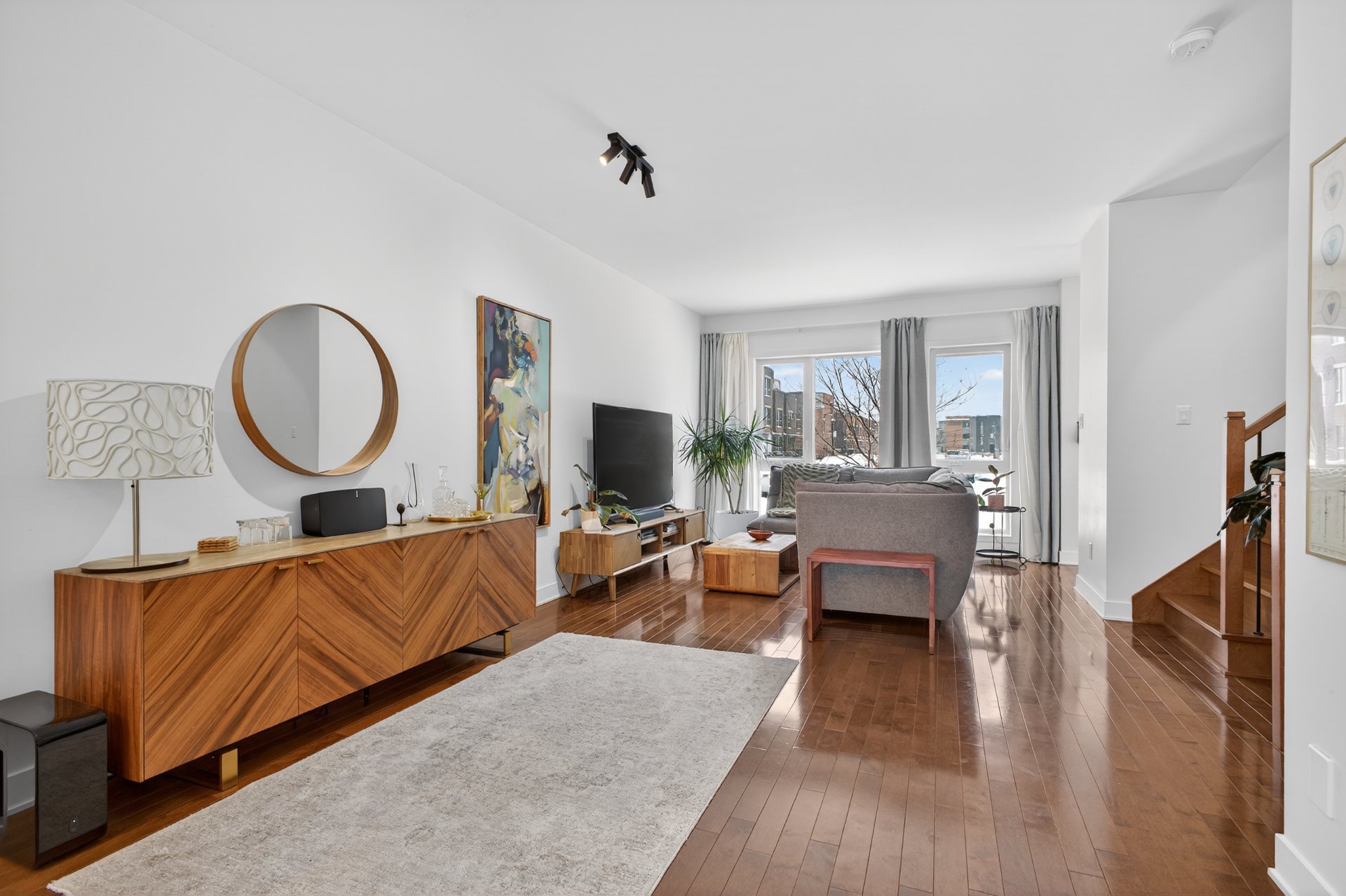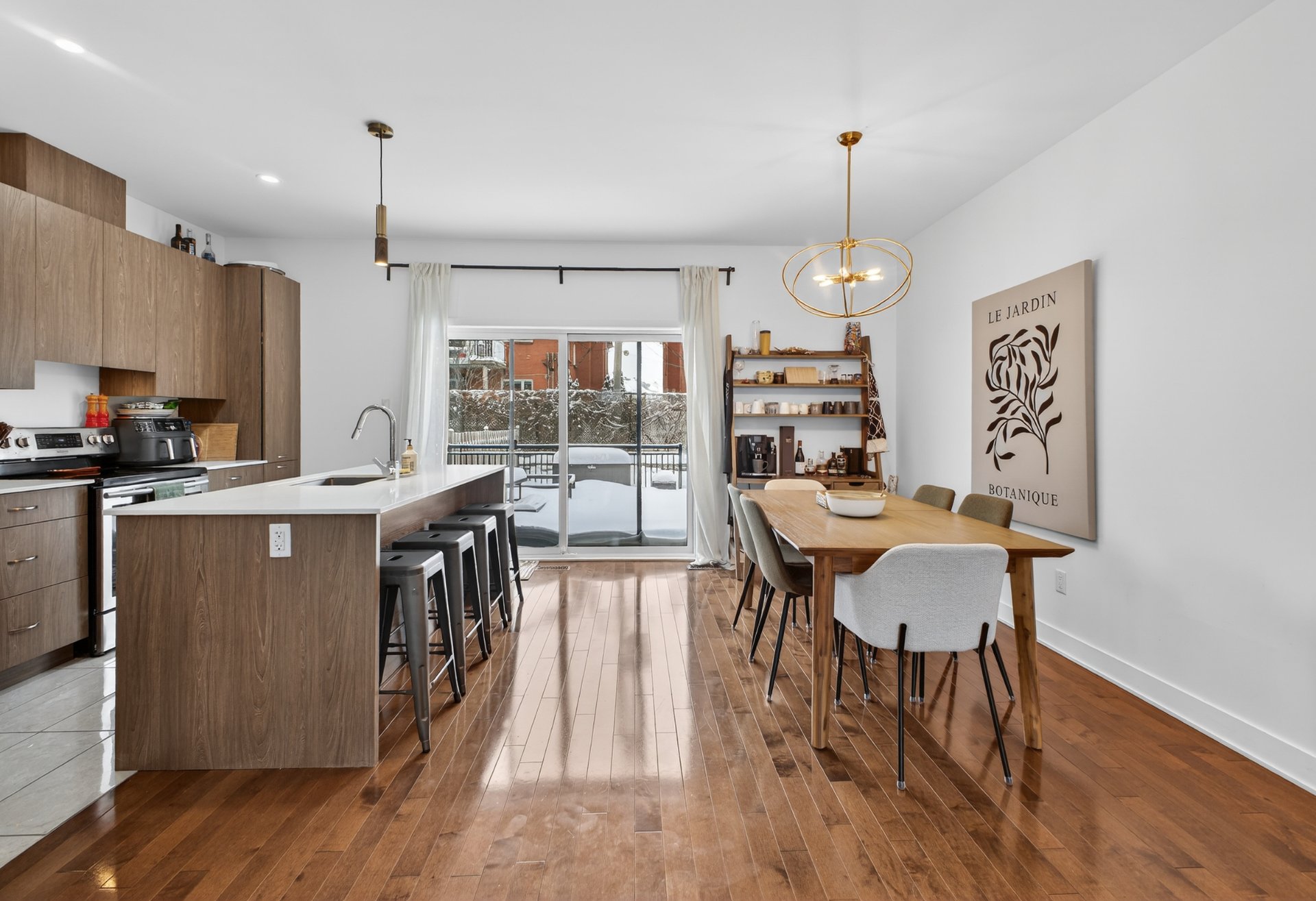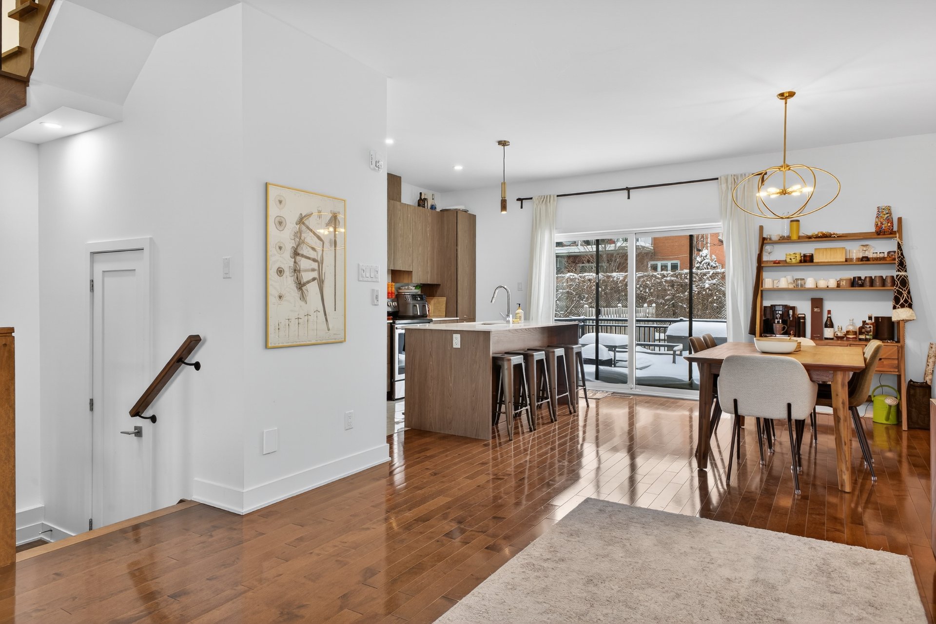 - Open concept living room and dining room, hardwood floor