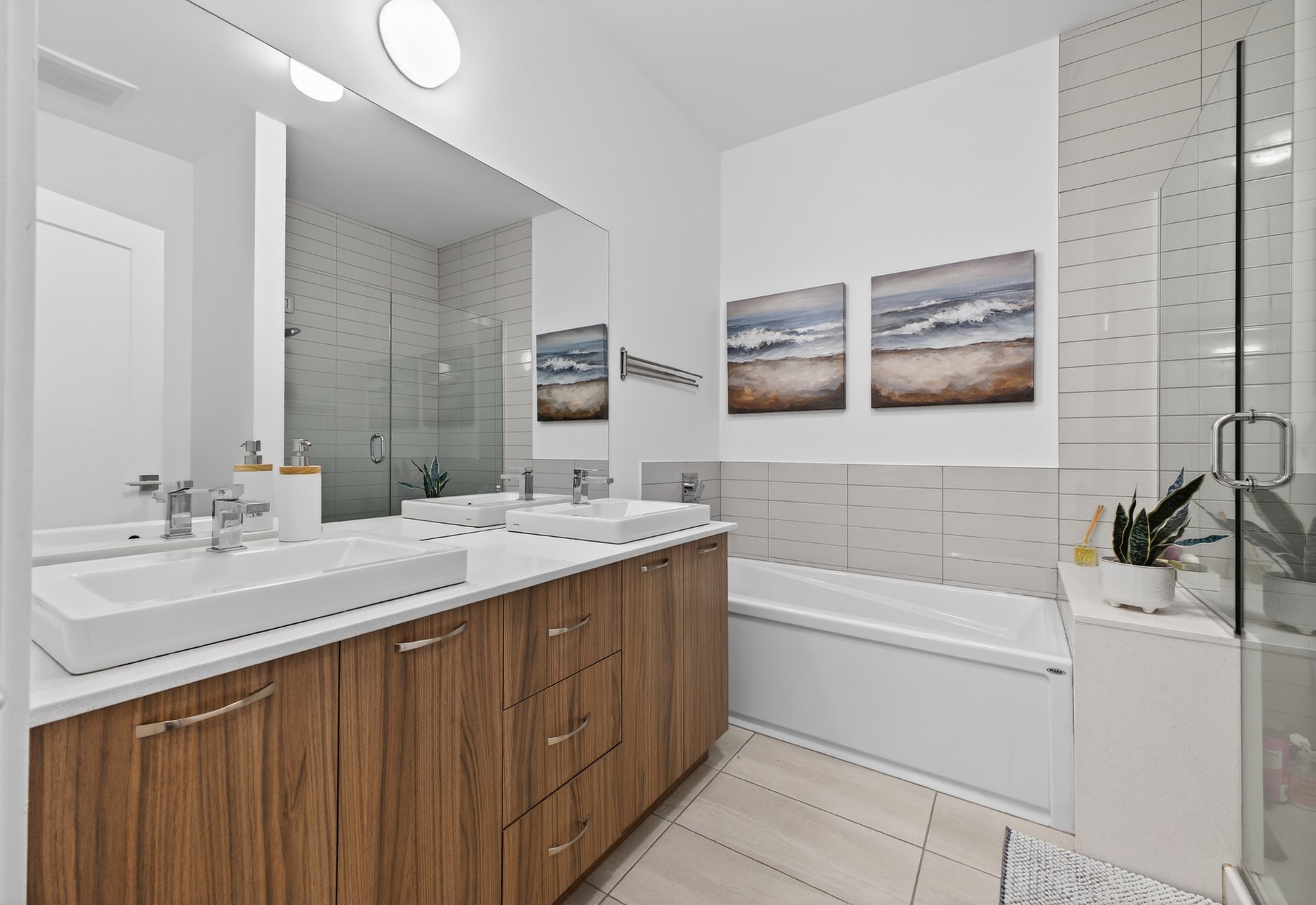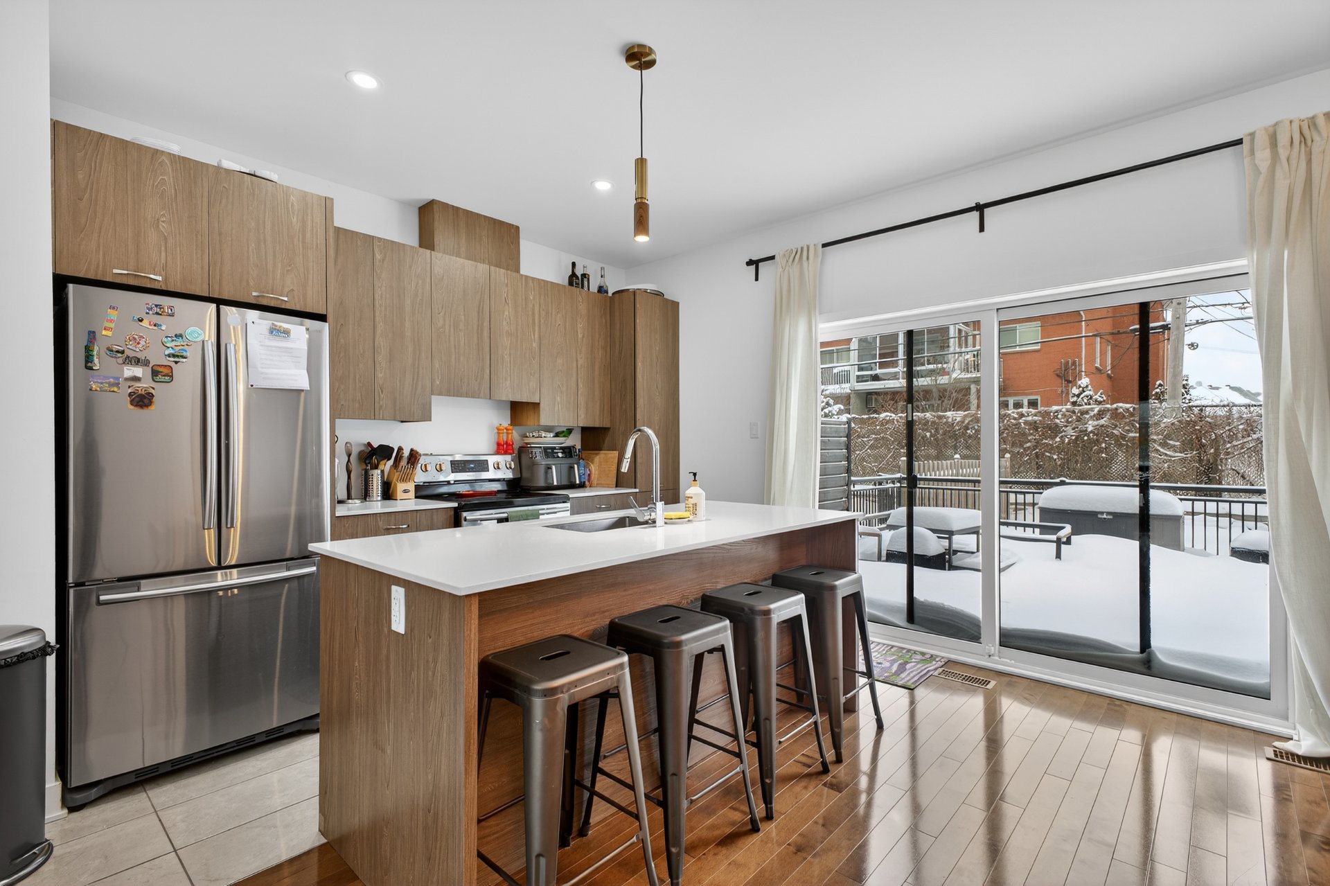 - A modern-style kitchen with quartz countertop, and a