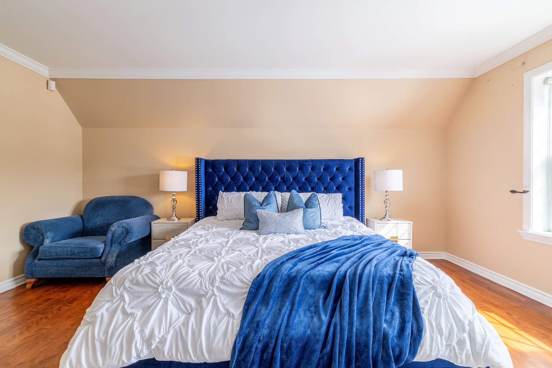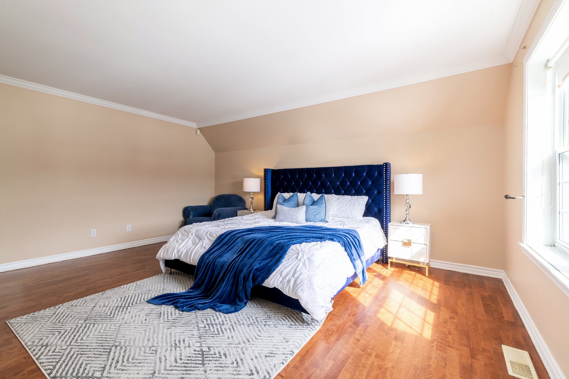 The upper level is home to the primary bedroom and its