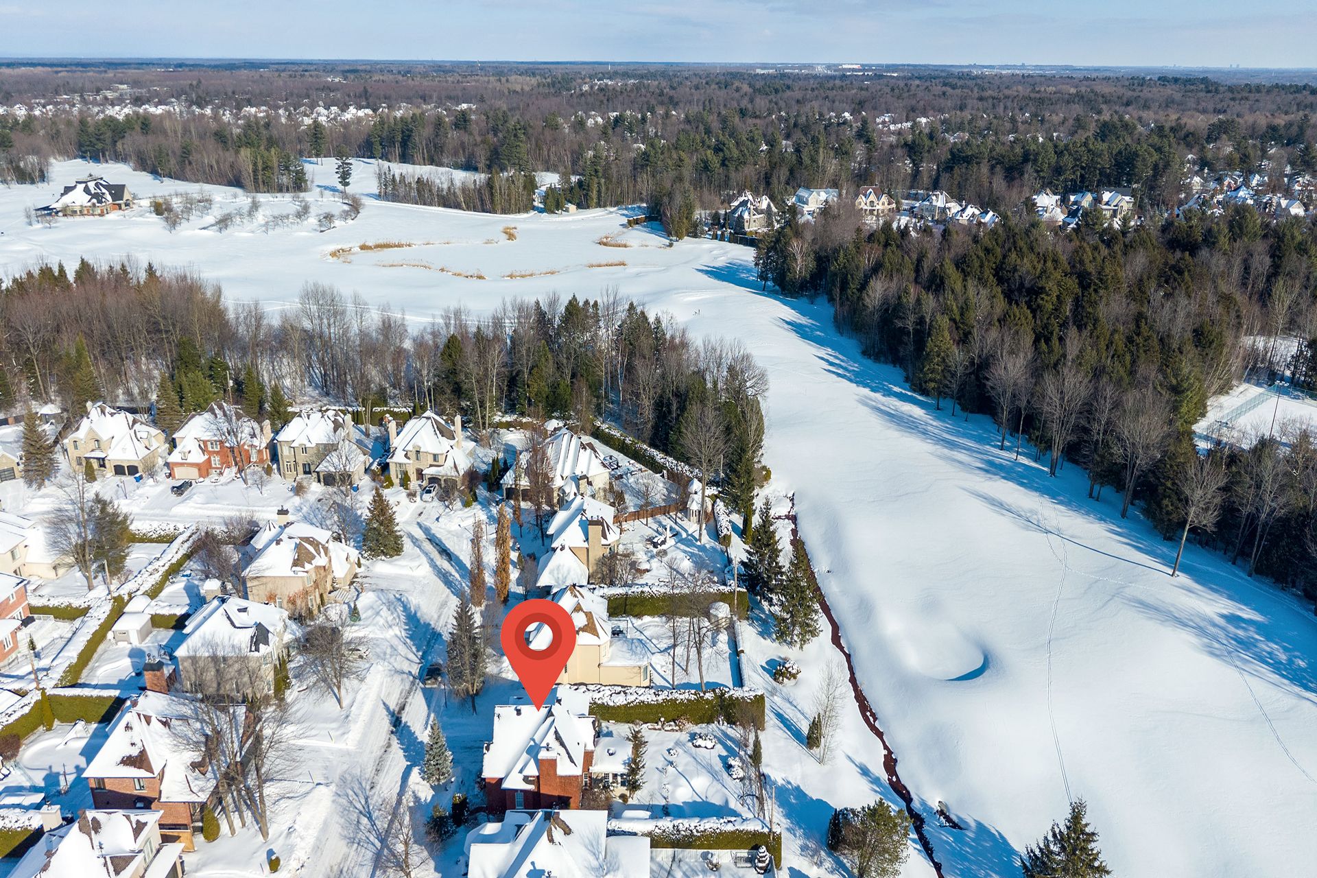 against the backdrop of the golf course. A four-season