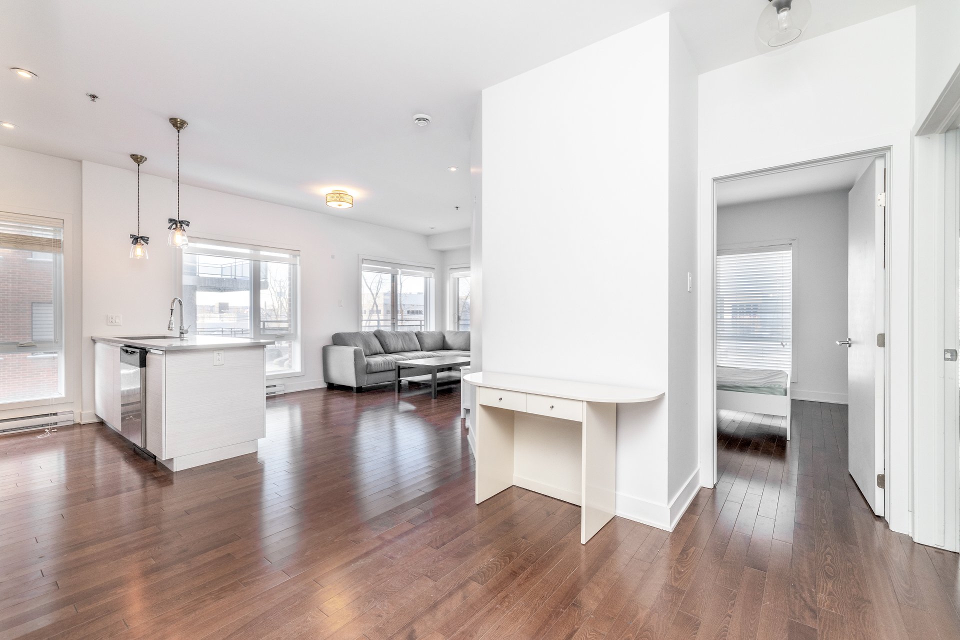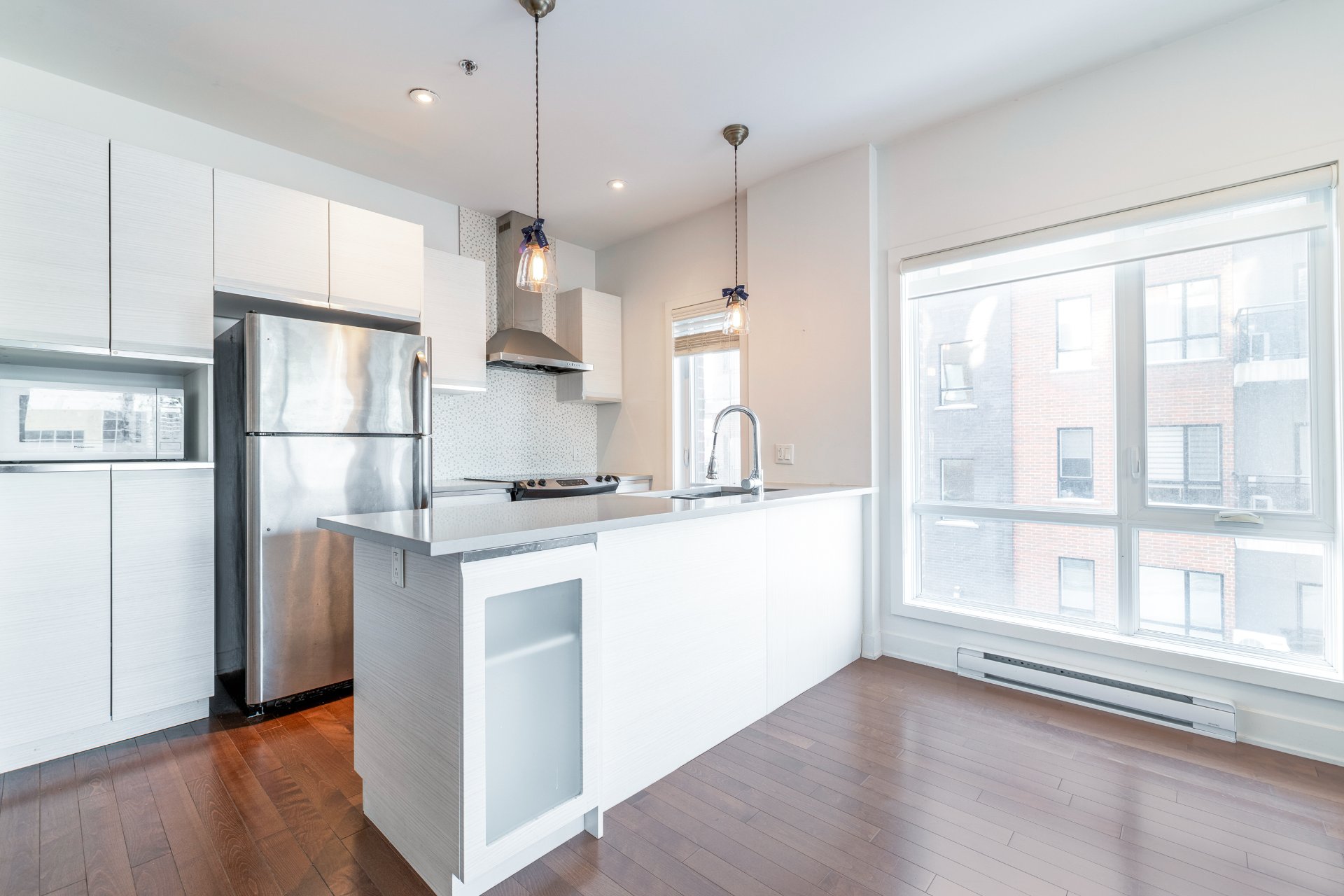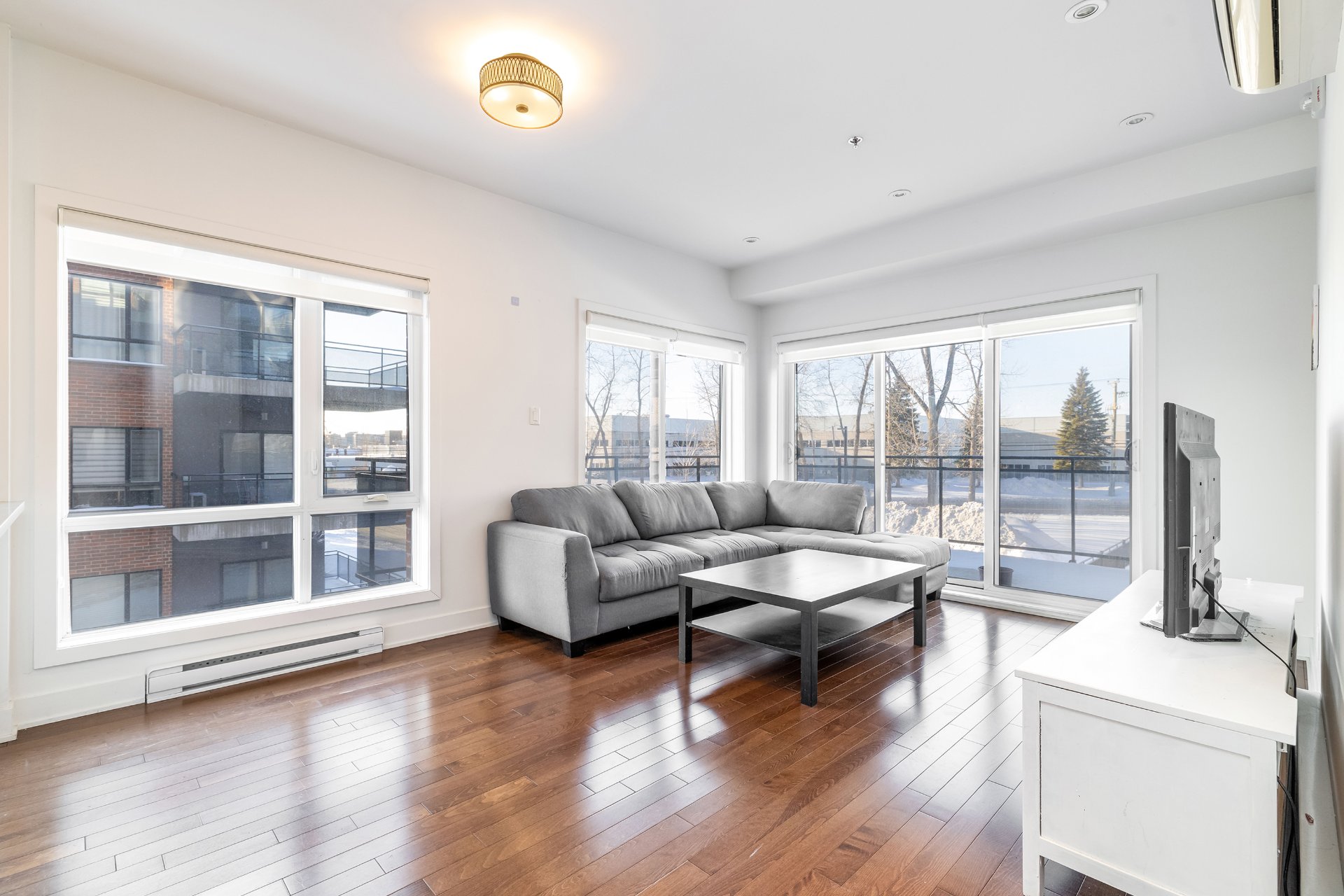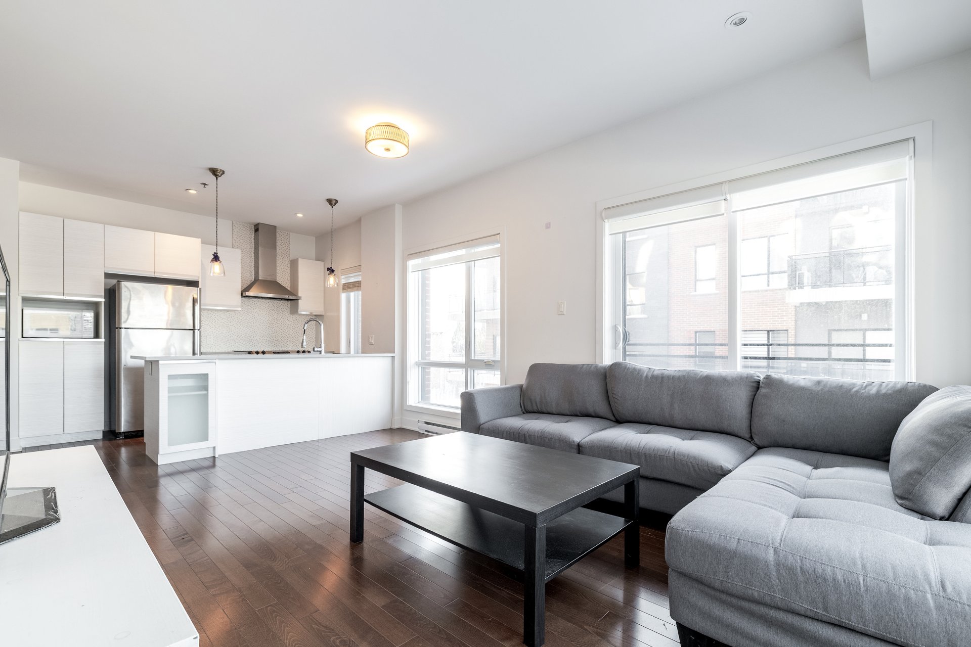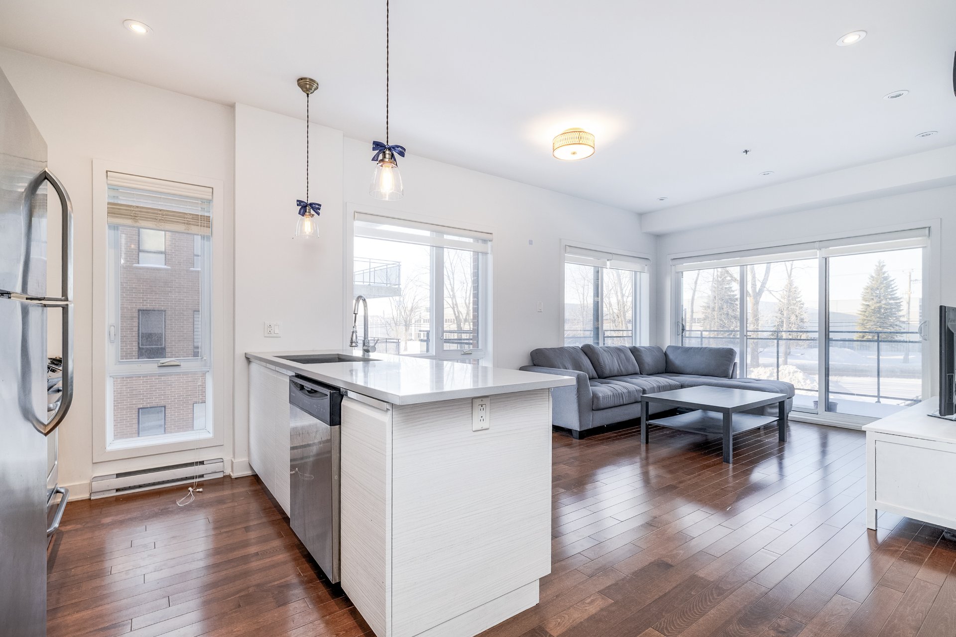 Designed for comfort and light, this second-floor corner unit in H1 Phase 2 offers an open, airy feel thanks to extensive windows throughout. A spacious wraparound balcony extends the living space outdoors. The two bedrooms are set apart from the main living areas, providing privacy and quiet, and both offer generous proportions and ample storage. Nine-foot ceilings and effective sound insulation create a peaceful environment. Indoor parking and a storage locker are included. Ideally located near REM stations, public transit, highways 40 and 20, and the shops and services of Des Sources and Saint-Jean.