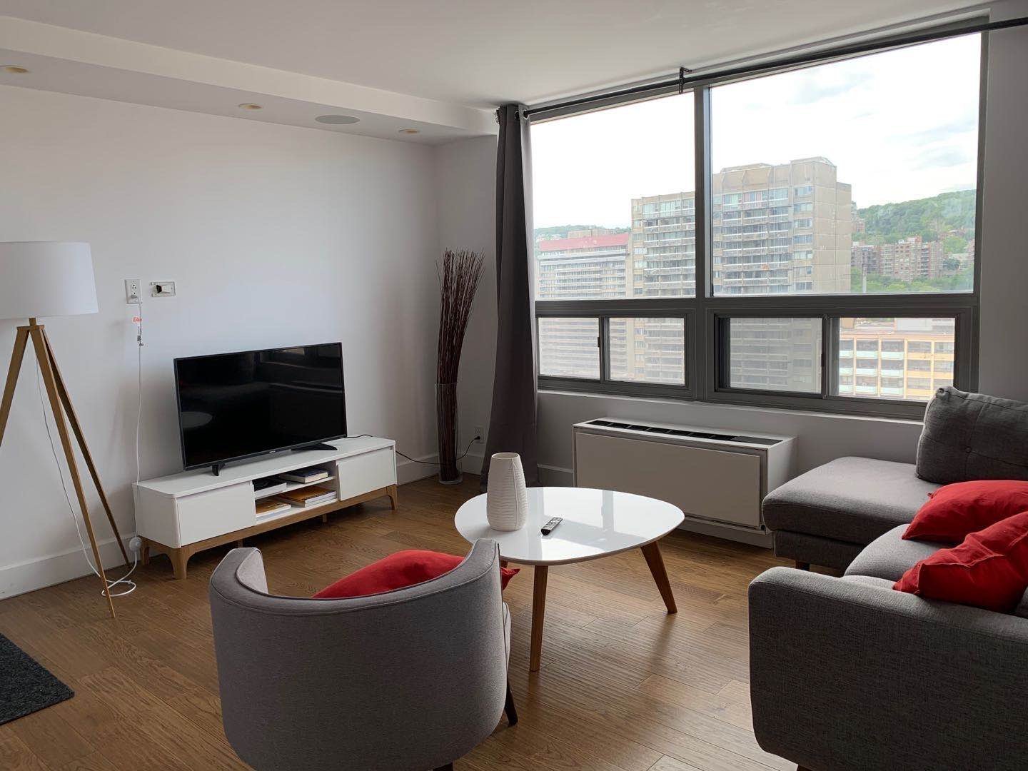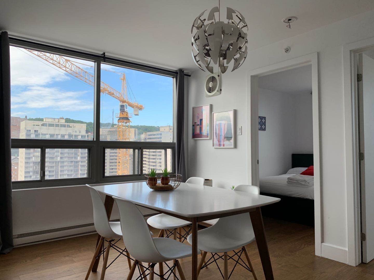 2-bedroom unit in downtown Montreal, close to everything! Rent includes furniture and all the utilities! The building has a gym on 2nd floor, common area and roof top terrasse on 19th floor. 24 hour security available in Lasalle college.