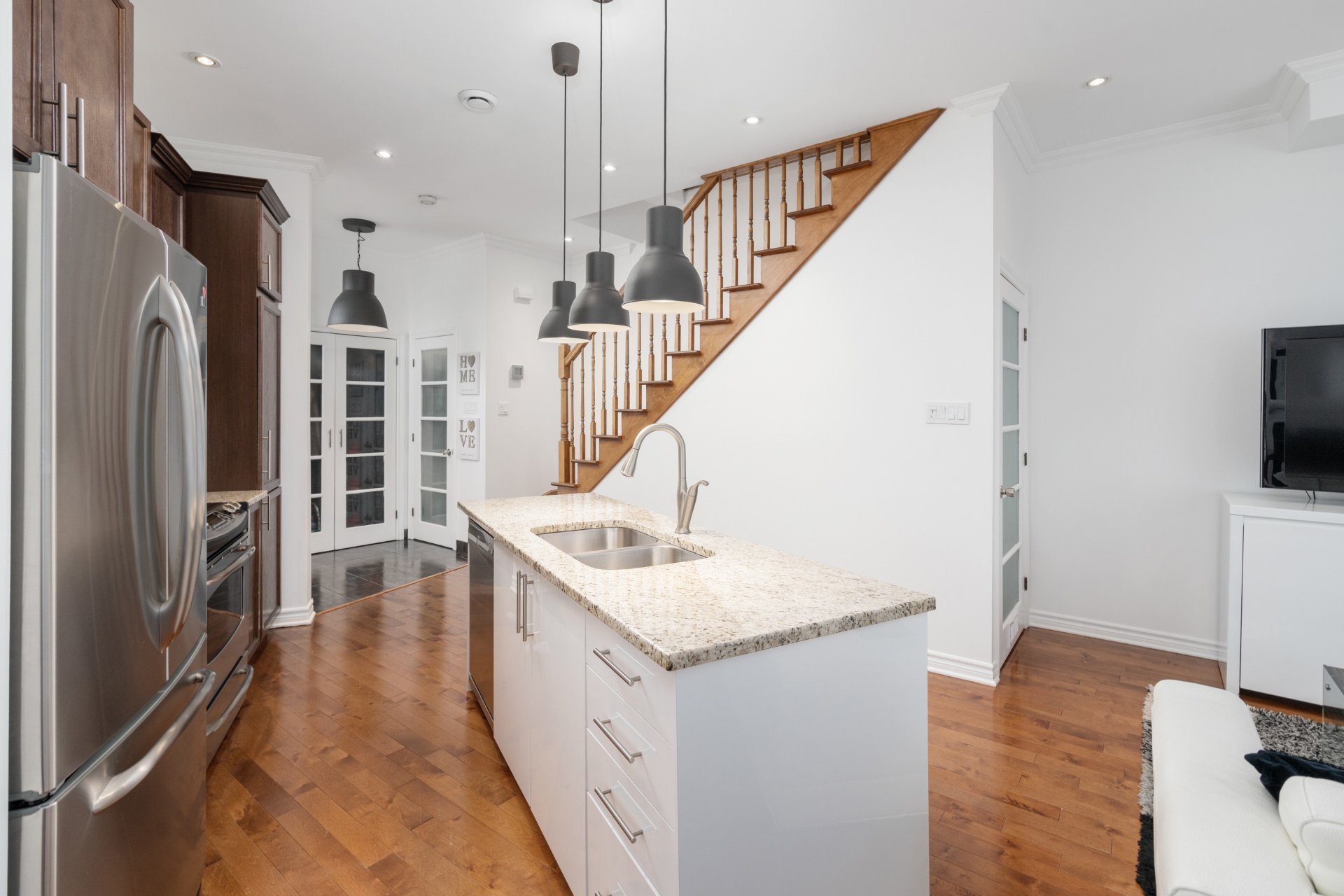 Fridge, stove, microwave/fan, dishwasher, washer, dryer, light fixtures, blinds, garage door opener, master bedroom set (bed, 2 nightstands, 3 large drawers), dining table and chairs, sofa, coffee table, TV and stand, snow removal, lawn care. The furniture included will be delivered AS IS, without further legal warranty of quality.