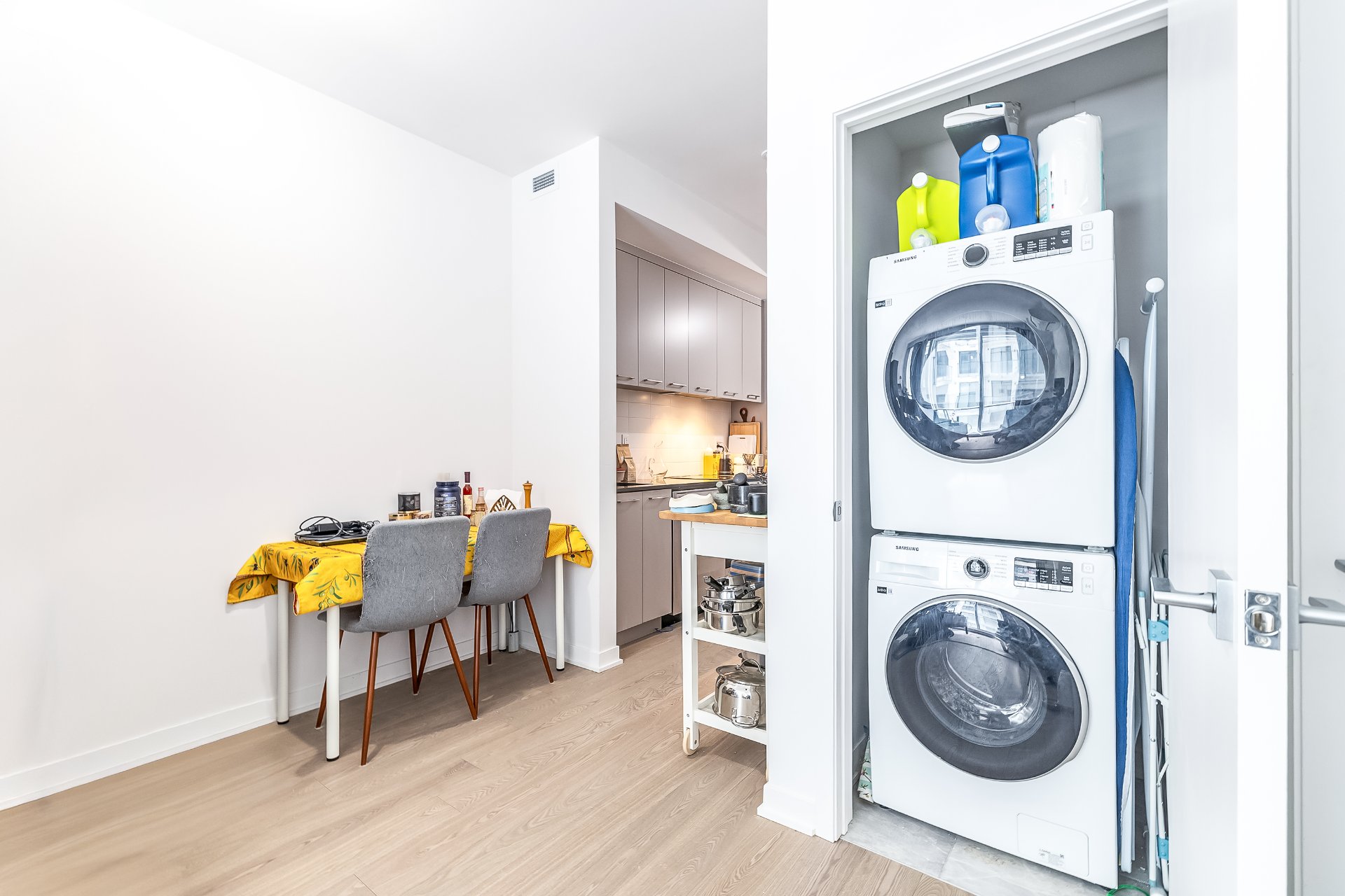 Fridge, stove, oven, hood, dishwasher, washer, dryer, wall-mounted air conditioning, air exchange system, intercom, locker, cold and hot Water.