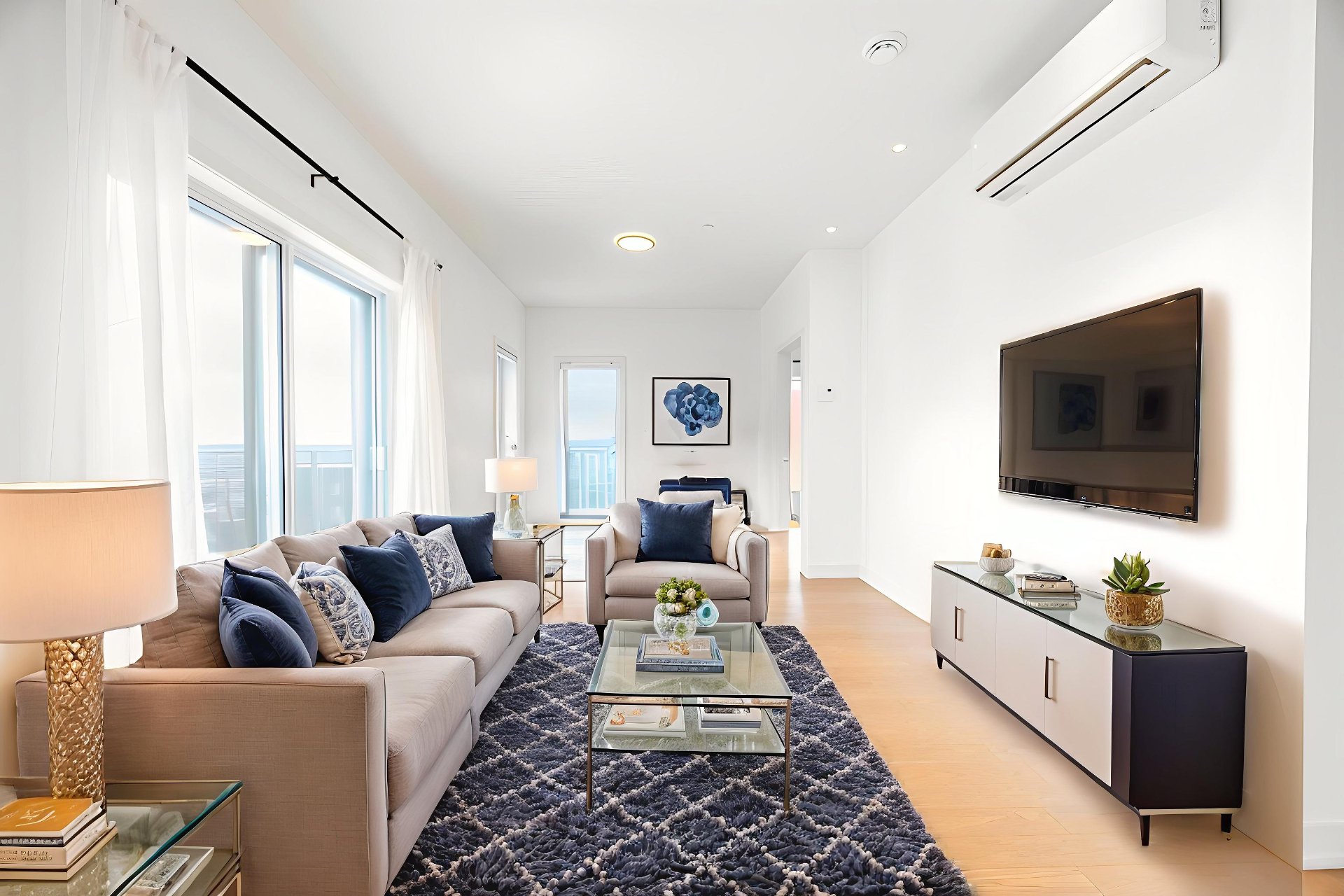 - Bright living room with large windows and access to the