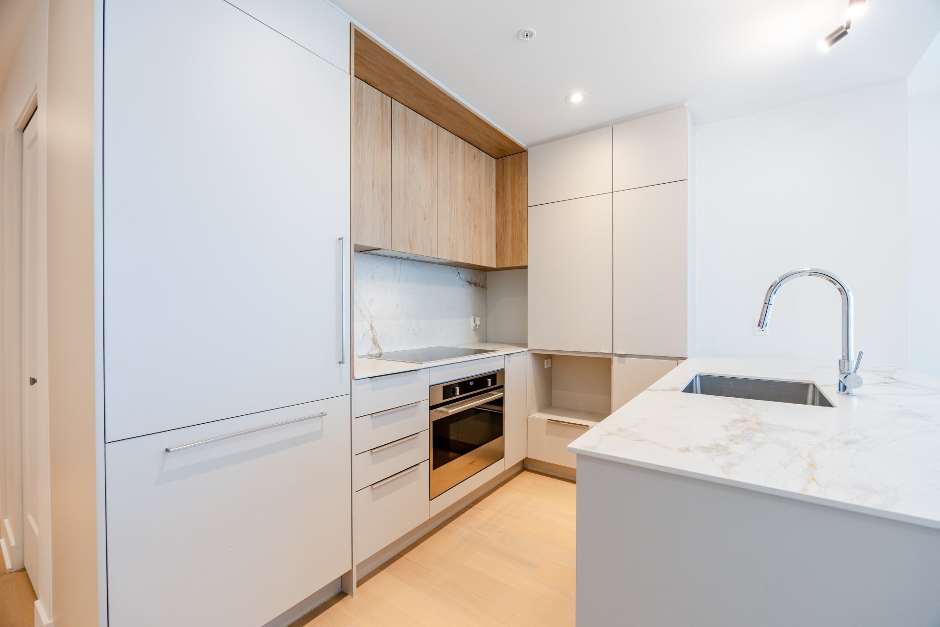 integrated appliances and quartz countertops and backsplash;