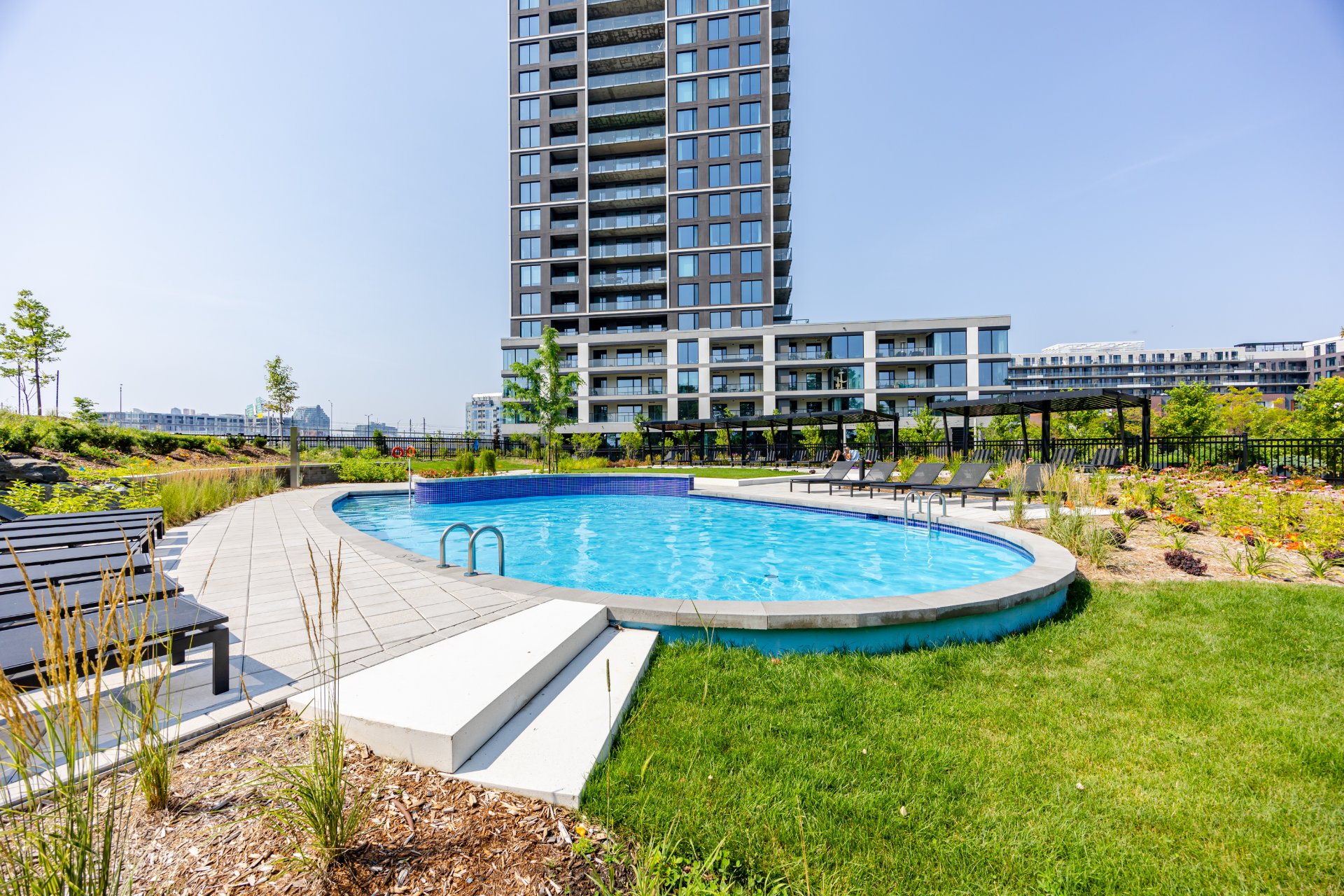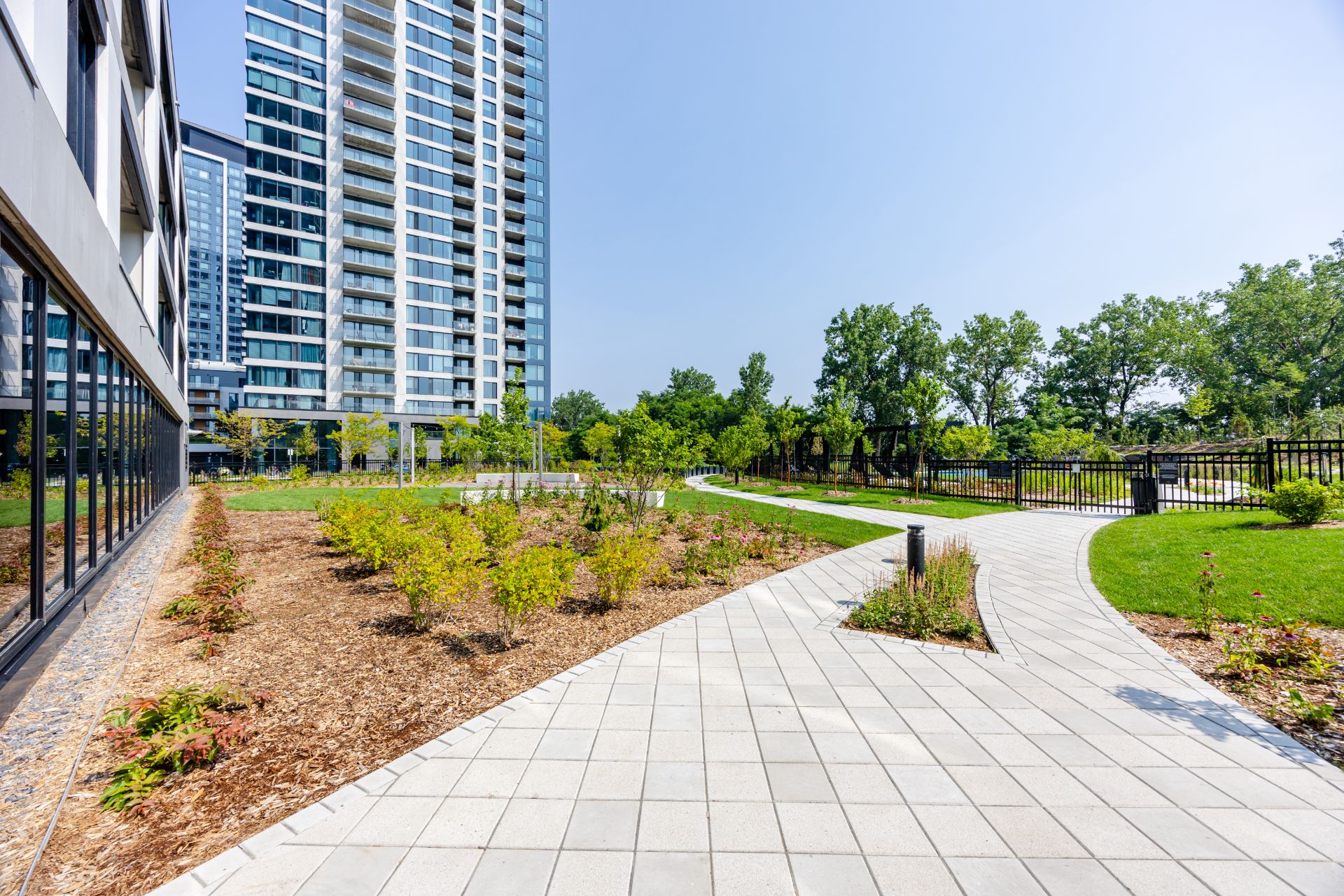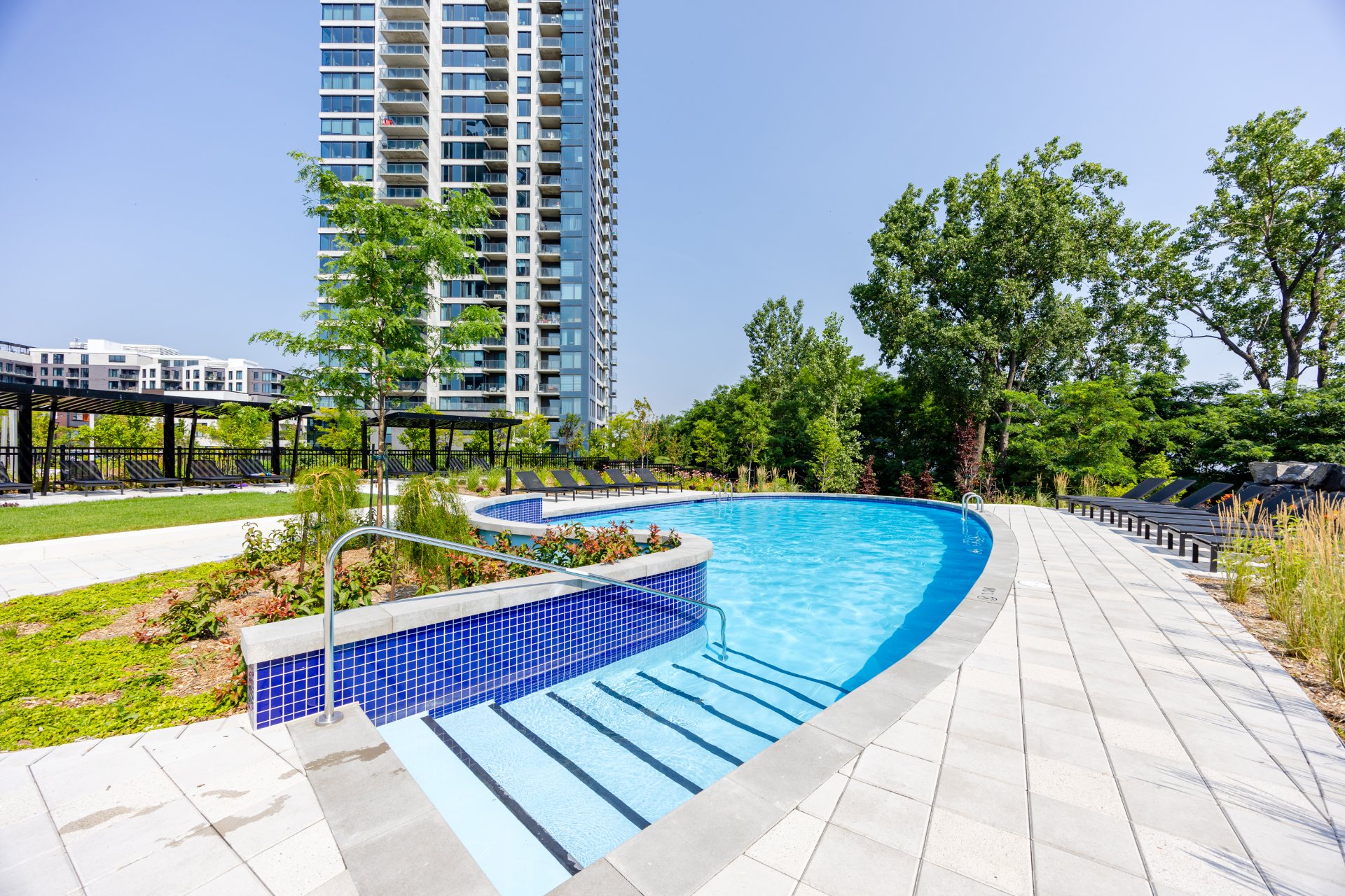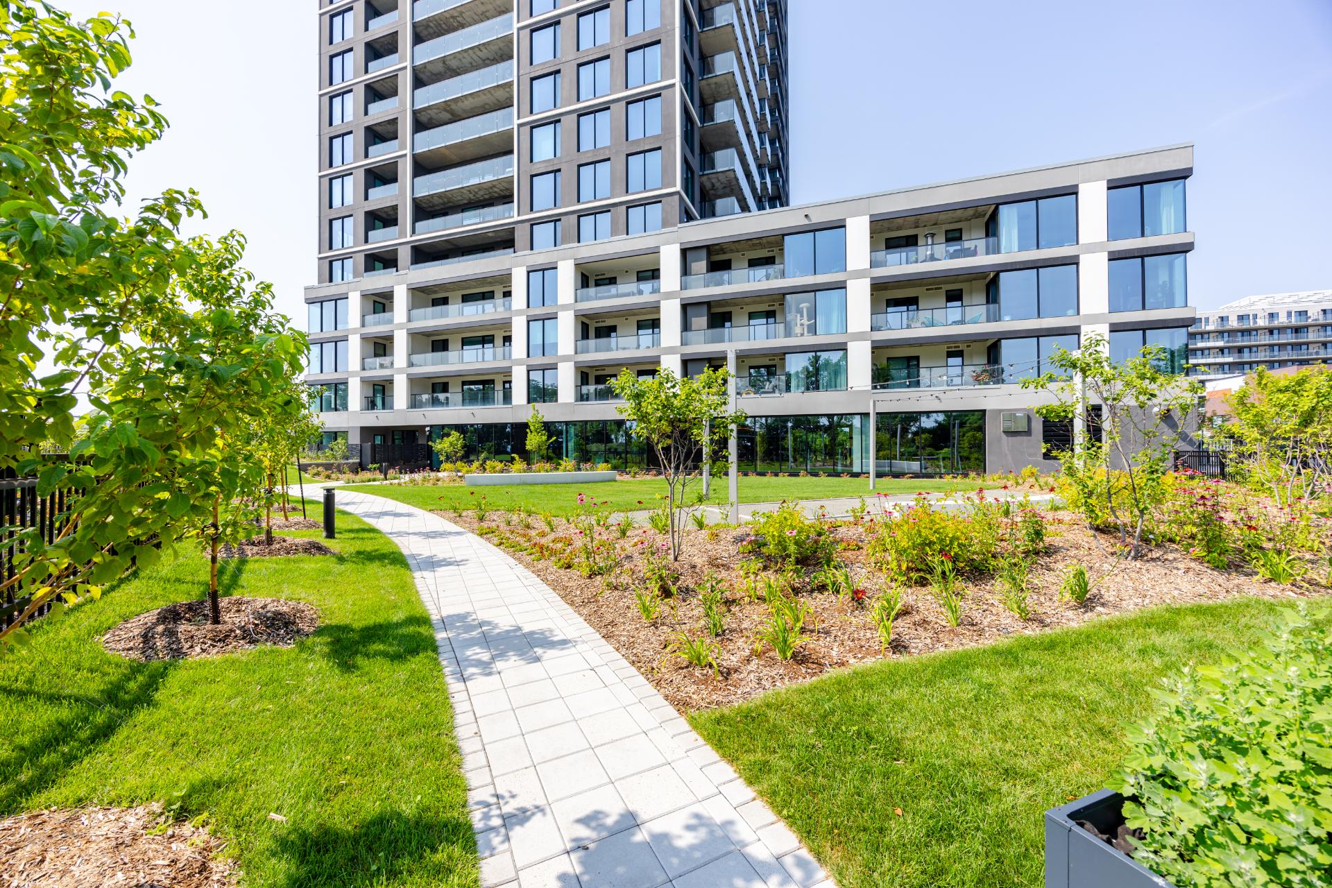 . Landscaped courtyard with panoramic river views